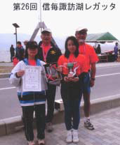 “表彰式”では、金色メダルを始め、長野県ボート協会杯の緑色美麗優勝カップ、優勝盾、諏訪ッチの腕時計(草野さんはこれが欲しかったらしい、単純)、信濃毎日新聞社からの小型バッジをゲット。道端での記念証拠写真撮影・即時プリントのサービス付きで、どこかのレガッタとは随分違うこと。