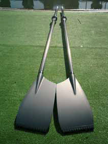 オールをはじめて見る多くの方は、その長さに驚かれます。スカルオールの長さは280〜290㎝です。確かに長いですね。しかし、オールの凄いところは、その強度にあります。材料等についてはあくまでも経験と思い込みだけで話をしているので深く触れませんが(確かFRP・カーボンあたりだったような気が・・・)。特にブレード(板)部分の強度は半端ではありません。疲労でシャフト(棒)部分がポキッと折れてしまうことはたまに聞きますが、ブレード部分が割れたという話は聞いたことがありません。オールの運搬をする時も、ブレードよりもシャフト部分等を大事にしています。