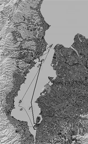 もう日差しは十分強いが、近江大橋をくぐってしばらくいってもまだまだ湖面は静かだ。浜大津沖でUターンするつもりで先に進む。ときどきモーターボートは通るものの、波はそれほど気にならない。ところが、浜大津を過ぎるあたりで、波が出だした。西風が吹いてきたのだ。波を避けるために進路を西岸に向ける(地図a)。波に直角にすると少々の波でも比較的安定して漕げる。予定通り波が小さくなってきた。そうすると欲が出てきて、艇首を南に向けるところを、北に向けてしまった(地図b)。それでも、まだ引き返す気ではいたのだが、湖面はかなり凪いできた。