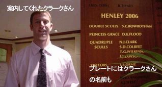 1週間ドイツに滞在後,ロンドンに向かいました.新婚旅行以来13年ぶりでした.イギリス留学中のデューク小林さんと連絡を取りましたが,時間が合わず会うことはできませんでした.彼からはHenley on Themesにある「Rowing Museum」を薦められ,滞在中唯一の休みにそこに行くことにしました.以前会報で元会員の山崎義昭さんがそこを訪問したと記載がありましたが,Henleyに行けばロウイングクラブも近くにあるだろうと思い,下調べもせずHenley on Themesに向かいました. ロンドンから電車に乗り,1時間余りで到着.駅から少し歩くとThemes川に出ました.水上を見回すとカヤックが1艇漕いでいるのみでボートの姿はありませんでした.しかし対岸にボートが置いてあるのが見えたので,橋を渡って対岸へ向かいました.橋を渡るとすぐ左に煉瓦造りのクラブハウスとボートが見えました.そこはかの有名な「Reander Rowing Club」でした.三宅さんから以前,Reanderにはピンセントが所属し,クラブのマスコットは「ピンクのカバ」と伺っていましたが,その通りでした.厚かましくもアポなしで訪問し,日本のセタロウイングクラブに所属しており,クラブハウスを案内いただくようお願いすると,選手兼アルバイトでクラブハウスの管理をしているクラーク(写真)に中を案内していただきました. 日曜の午後で選手は練習しておらず,クラブハウスにもいないようでしたが,年配の方々がクラブハウスのレストランで飲食を楽しんでいました.クラブハウスは3階建てでエレベーターがあり,レストラン,トレーニングルーム,遠征チーム用の宿泊部屋,選手用の宿泊部屋,ミーティングルーム,コーチ部屋などを兼ね備えていました.クラブハウスに入ったところにはヘンリーレガッタ,世界選手権,オリンピックで入賞したクルーメンバーの名前の入ったプレートが整然と飾られていました.当然その中にはピンセントや案内してくれたクラークさんの名前もありました.「ピンクカバ」のアパレル商品(女性用パンツまで!)を販売していたので,お礼がてらウェアを購入してクラブハウスを後にしました.さすがに1830年代に創設され170年以上歴史のあるクラブだけあって,かなり格調高いクラブという印象を持ちました.このクラブは現在ナショナルチームのコーチが2名おり(瀬田漕艇倶楽部も同じですね),オリンピック優勝選手も輩出しており,世界レベルの選手をシニアの方々が支援している感じでした.このクラブは年配の方でレースに出てガンガン練習している人はそれほど多くないようで,週末にクラブに来て飲んだり食べたりしながら談笑している雰囲気でした.