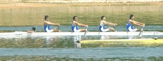 さあ、リギングの後は即席クルーでのリギング乗艇だ。今日の即席おやじクルーは、S京さん、3番高橋、2番黒田さん、B大迫さん、コックス今城会長といった布陣。長身クルーの出来上がりだ。といっても、当日のメンバーのうち、黒田さんがダブルエントリーでフォアの前にダブルスカルのレースに出場のため、2番に田村さんに乗っていただいての乗艇となった。即席クルーにさらに助っ人を入れての凸凹クルーだ。だが、意外にバランス、ローイングサイクル、リズムとも即席にしてはまあまあ良く、2年ぶりのフォアも「これなら漕げる」という感覚を持った。