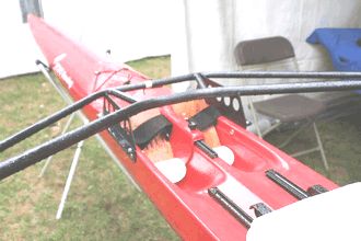 Eshoスカル艇:テクレーション・ローイングに便利な機能を備えている。リガーは折りたためるので移動には 楽で何処でも直ぐに漕げて、直ぐに収納が出来る。海外ではスカル艇を普通乗用車に積む事が認められて居るので2分割の要はない。あちこちの水面で容易に移動してローイングを楽しめる。重量なんか全く気にすることはない。