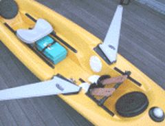 SEAスカル艇:外洋とか大きな湖の風や大波があるところでスカリングができる。艇体はSEAカヤックと同じく波をかぶっても艇内に溜まらないように一体構造になっている。ストレッチャーのシューズの部分のみ凹みを作ってある。パイプ製のウイングリガーは大波には都合の良い構造。朝日レや私の湖上通勤には最適かも。