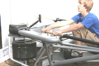 Sweep漕ぎエルゴ:Sweepローイング独特の上体をツイストして漕ぐ姿勢でエルゴテストができる。従来の直線引きのエルゴより一層ローイングに近いシュミレーション・テストが可能。(桑野造船でもSweepやドラゴン用を開発中)