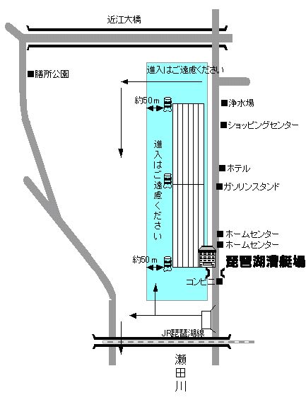 これに伴い、上記の時間帯は下図の部分は秋季高校総体ボート競技による湖面占有区域となりますので、事故防止のためにもこの区域への進入をしないでください。目安は、赤白ポールから沖へ約50mまでが湖面占有区域(進入禁止区域)となります。皆様のご協力をお願いいたします。
