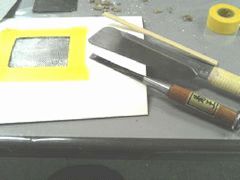 傷の箇所を加工しやすいように鋸で四角く抜き、ガラス繊維、樹脂材、カーボン繊維を使用して補修