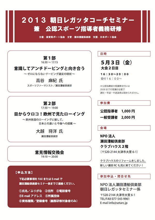 (参加申込方法)別紙申し込み用紙に記入の上、瀬田漕艇倶楽部までお申し込み下さい。クラブにFAXもしくはE-mail(所定申込書添付)にて連絡して下さい。