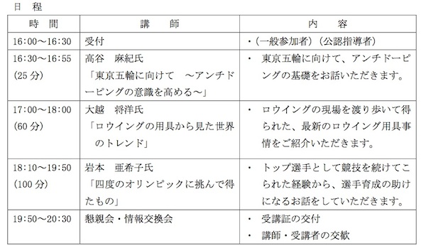 | 講師 | ・高谷 麻紀 氏 (スポーツファーマシスト 瀬田漕艇倶楽部) ・大越 将洋 氏 (瀬田漕艇倶楽部) ・岩本 亜希子 氏 (アイリスオーヤマ 4大会連続五輪代表選手) |