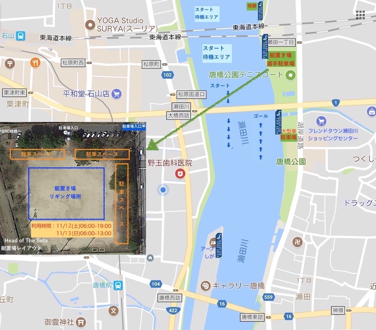 選手受付場所は2018年から「瀬田漕艇倶楽部・FurukawaHouse(クラブハウス)」に変更になってます。開催日程 第1日目 2022年11月12日(土) 第2日目 2022年11月13日(日) 10:00〜11:00 受付(瀬田漕艇倶楽部・FurukawaHouse) 7:00〜8:00 受付(瀬田漕艇倶楽部・FurukawaHouse) 12:00〜 レース 09:00〜 レース